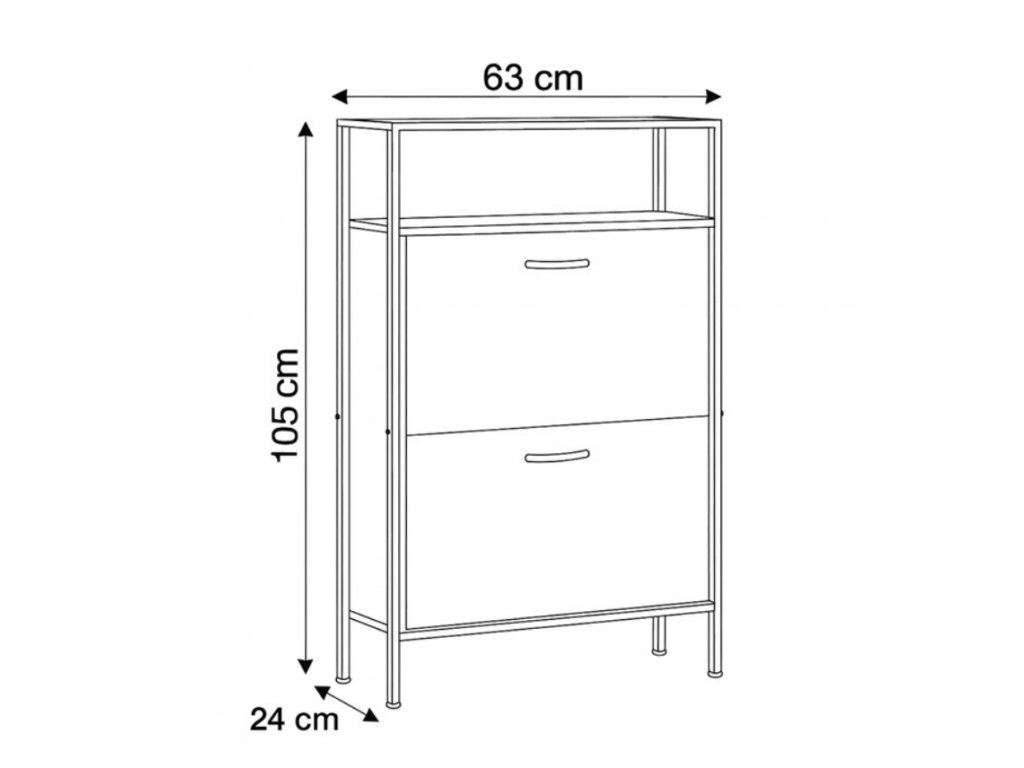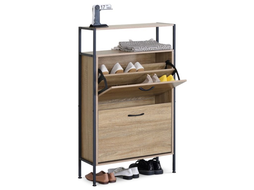 Botník ABO-G1007 OAK přináší stylové a praktické řešení pro uložení obuvi. Díky kombinaci desek z MDF v dekoru dubu a černé kovové konstrukce působí elegantně a hodí se do moderních i industriálních interiérů. Nabízí dvě prostorné přihrádky s černými úchytkami a dvě otevřené police, které umožňují přehledné uspořádání obuvi i drobných doplňků. Horní deska může posloužit jako odkládací plocha na tašky či dekorace. Stabilní konstrukce zaručuje dlouhou životnost, zatímco úzké nožky usnadňují úklid pod botníkem.