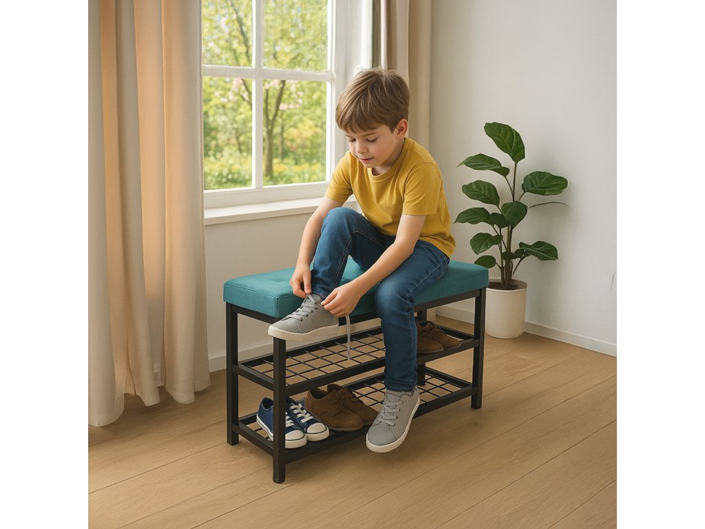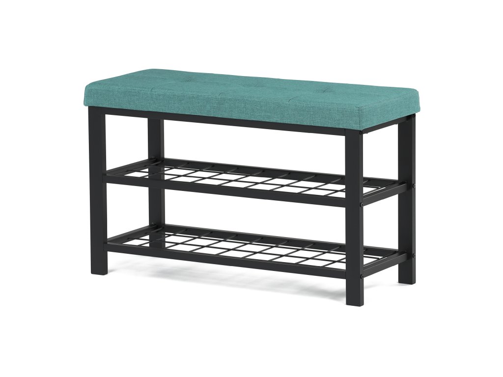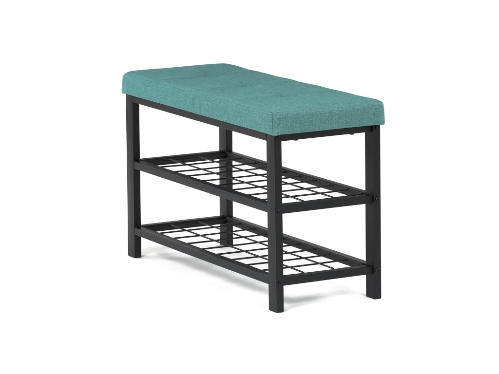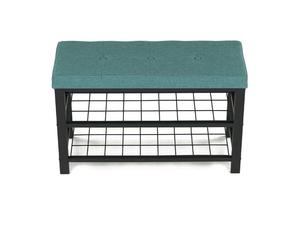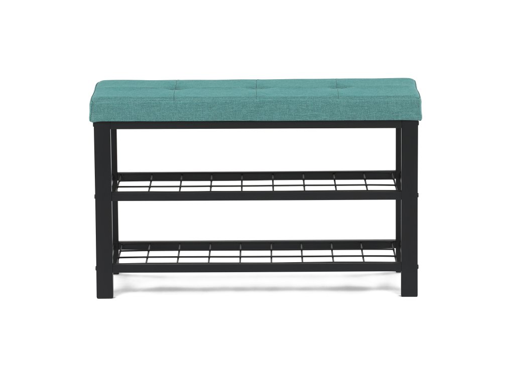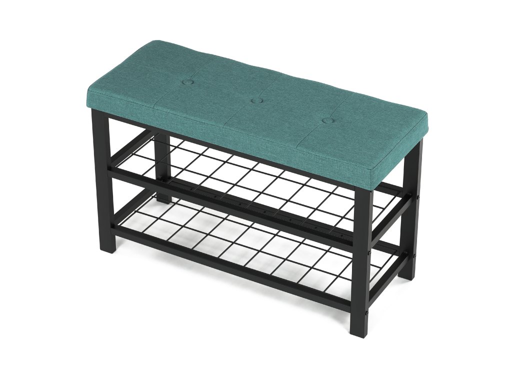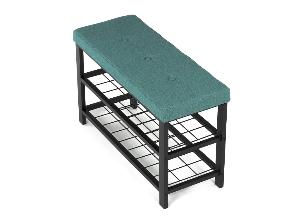 Stylový botník s čalouněným zeleným sedákem nabízí pohodlné místo pro obouvání i praktický úložný prostor. Dvě kovové police pojmou několik párů bot, pevná konstrukce zajišťuje stabilitu a dlouhou životnost. Moderní kombinace zelené a černé barvy dodá vaší předsíni osobitý a elegantní vzhled.