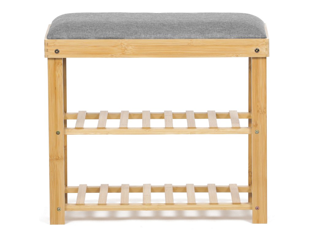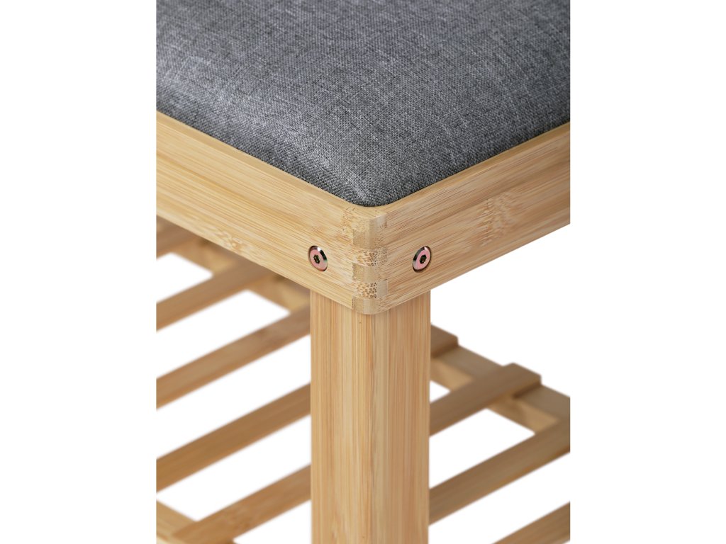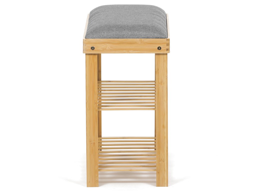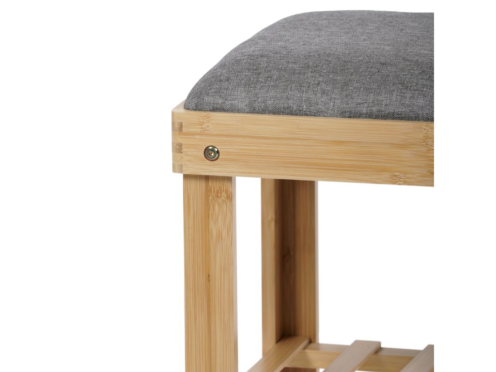 Stylový botník z masivního bambusu v přírodním odstínu doplněný šedým čalouněným sedákem.