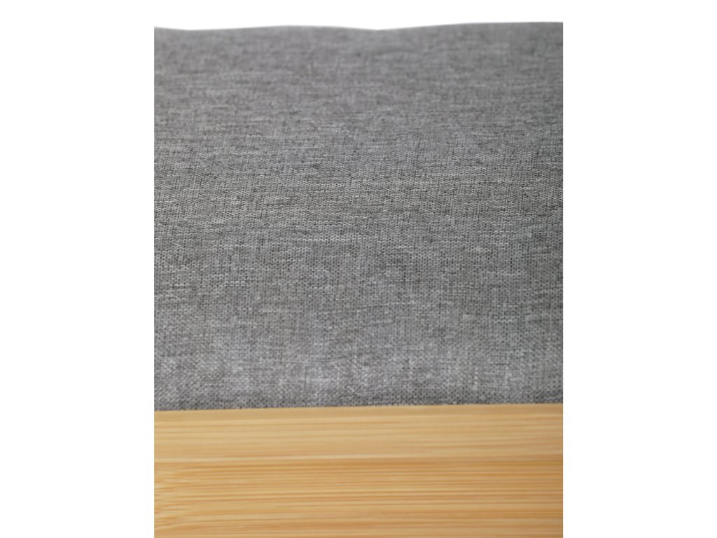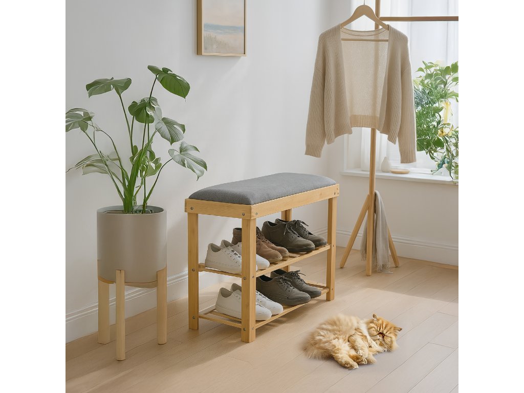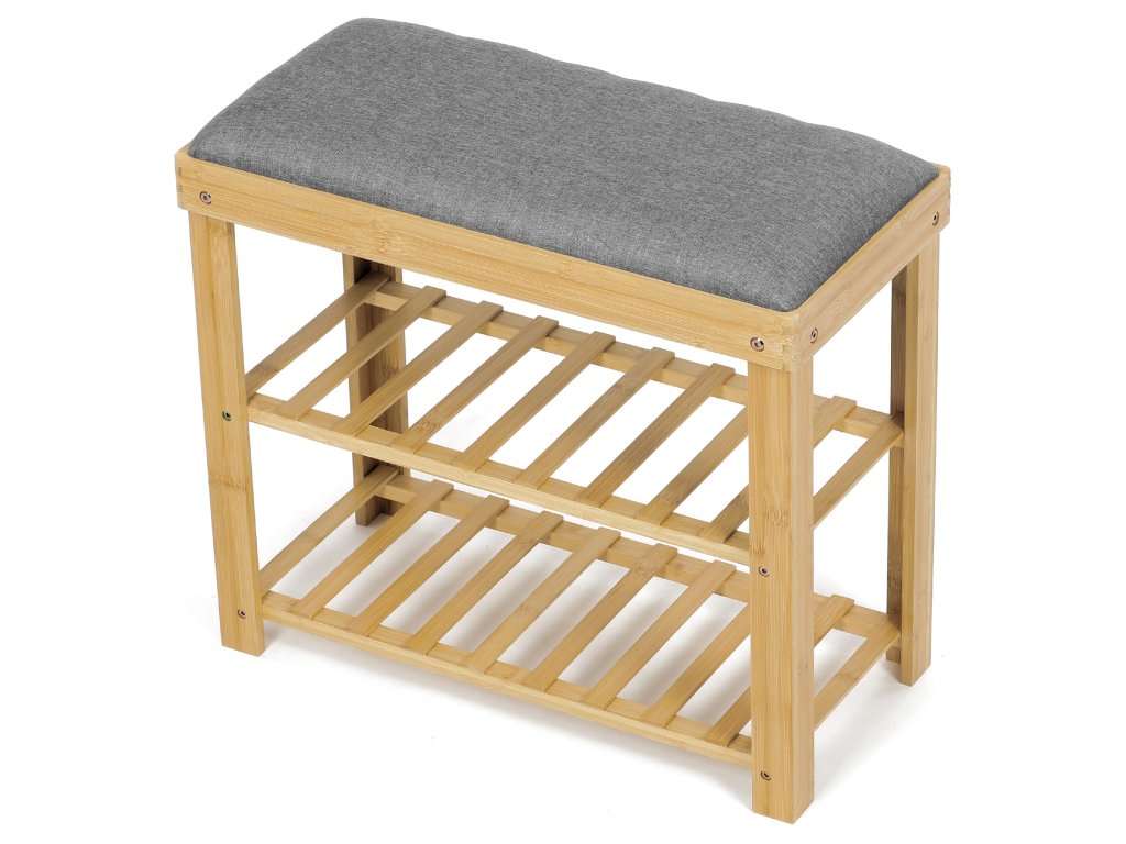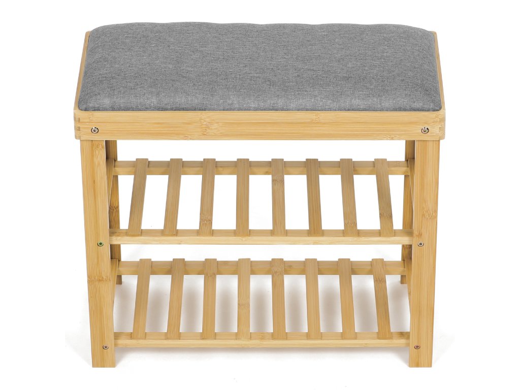 Stylový botník z masivního bambusu v přírodním odstínu doplněný šedým čalouněným sedákem.
