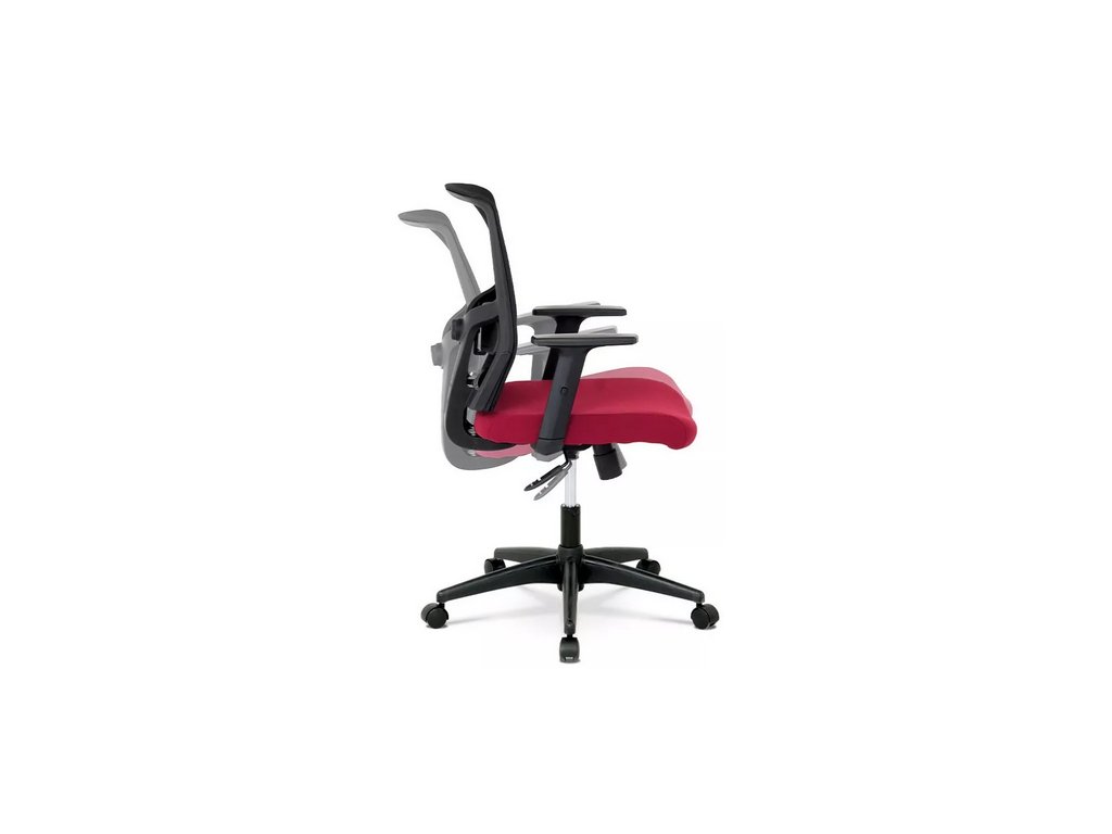 Kancelářská židle KA-B1012 BOR v červené barvě je vybavena výškově nastavitelnými opěrkami, pasivní bederní podporou a plastovým křížem s kolečky vhodnými na koberce. Opěradlo je ze síťoviny, sedák očalouněn látkou. Židle je výškově nastavitelná s houpacím mechanismem a nosností až 120 kg.