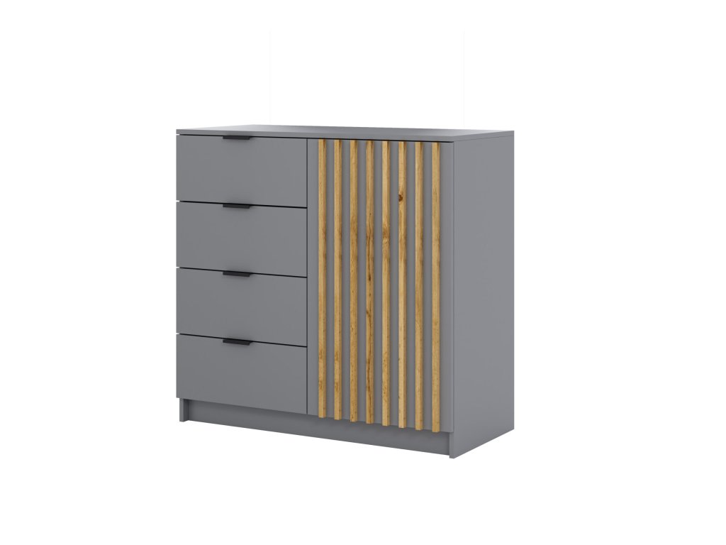 Stylová komoda v šedém provedení s lamelovými dvířky v dekoru dub votan nabízí 4 zásuvky, 1 polici a je doplněna černými kovovými úchyty. Skvěle se hodí do obývacího pokoje, ložnice i předsíně.