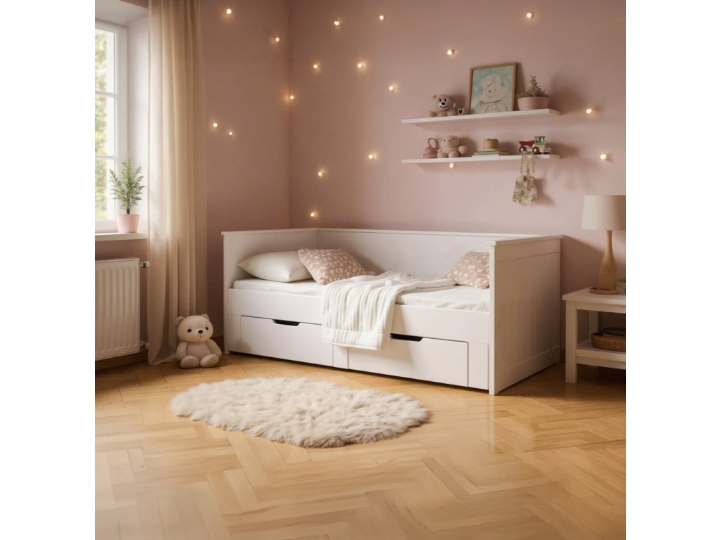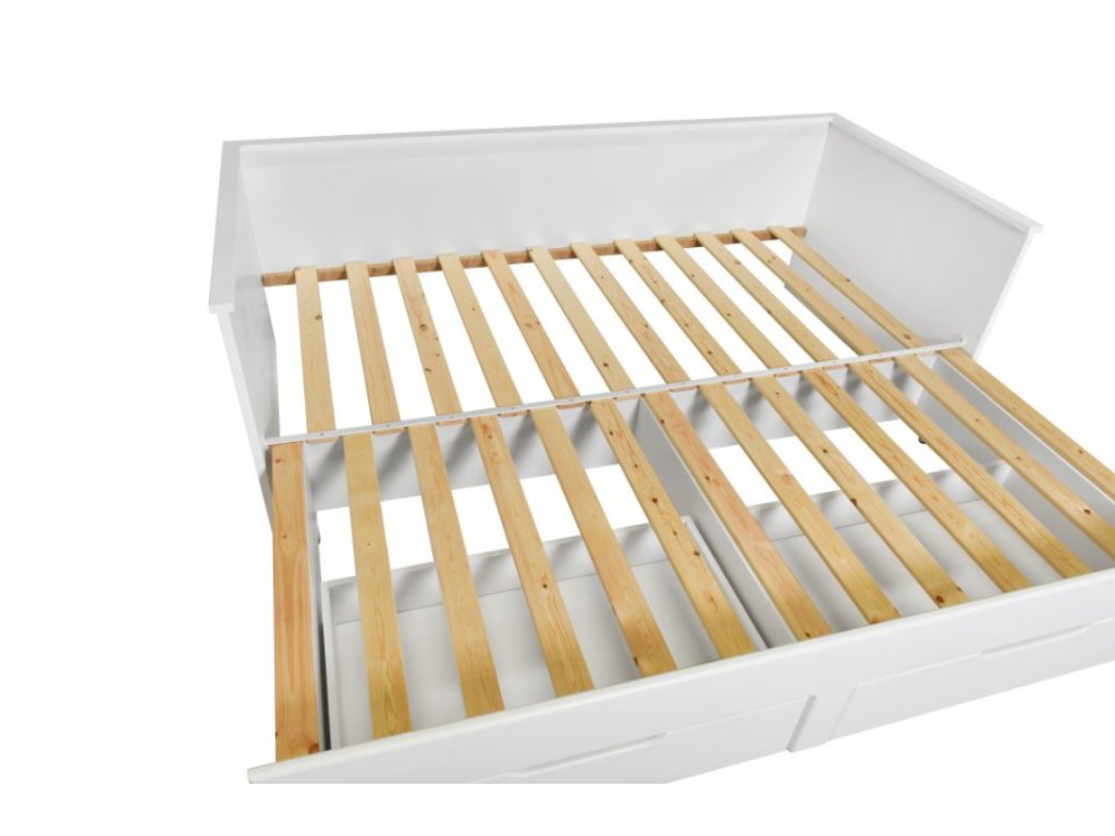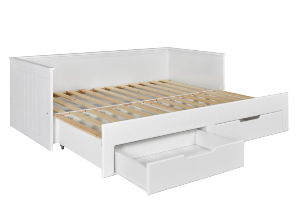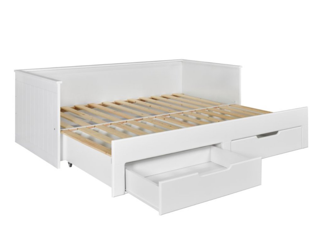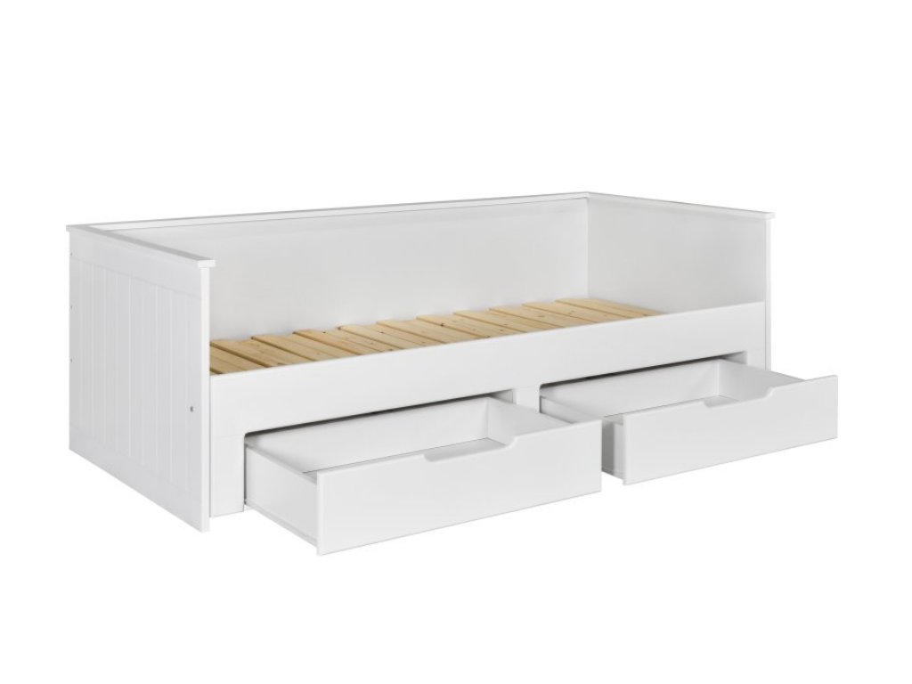 Praktická bílá postel MARTA je vhodná do dětských a studentských pokojů. Umí sloužit jako jednolůžko, dvoulůžko i pohovka díky chytré rozkládací konstrukci. Součástí jsou 2 velké šuplíky, rošt a matrace SOLO.
