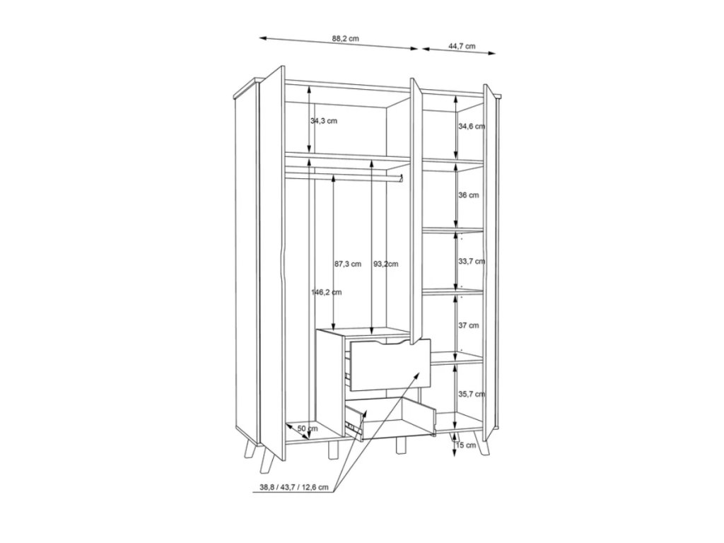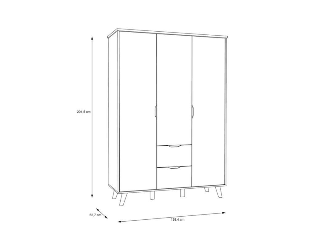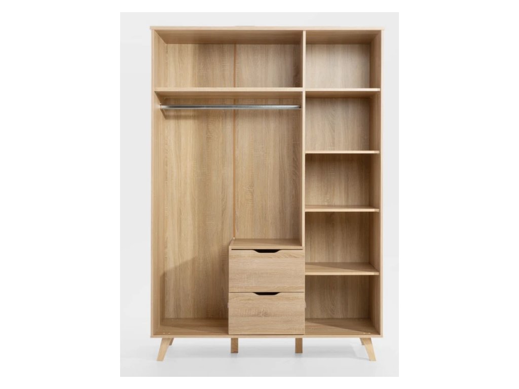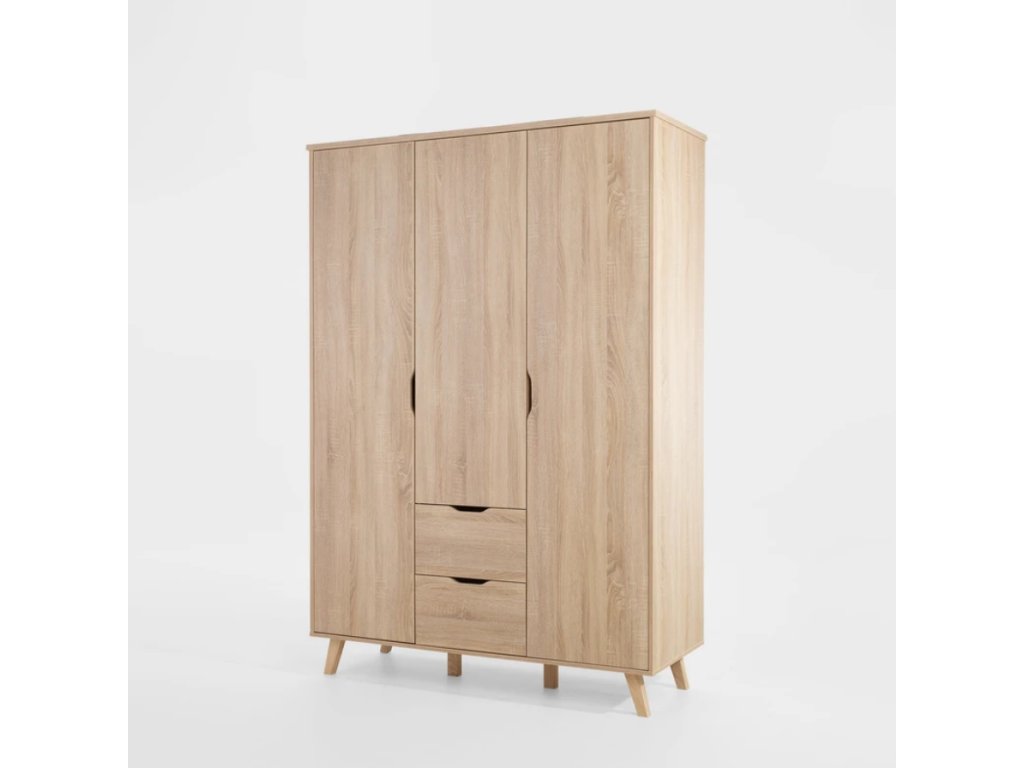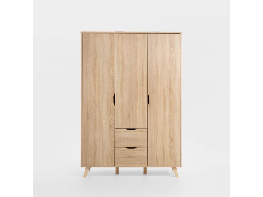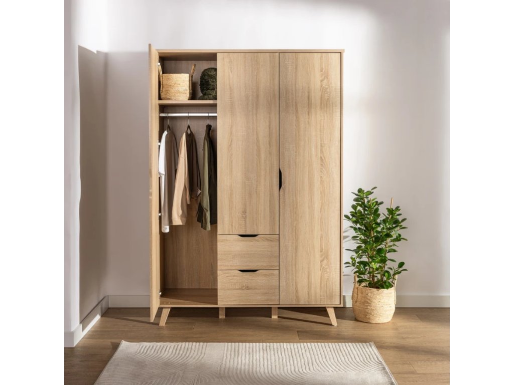 Šatní skříň VANKKA je praktickým řešením do ložnice, studentského pokoje i předsíně. Nabízí dostatek úložného prostoru v kompaktní šířce a světlý dekor dubu dodá interiéru útulný, skandinávský vzhled. Šikmé dřevěné nohy podtrhují lehký a moderní styl.