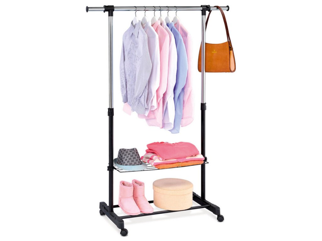 Praktický jednoramenný stojan na šaty s pojezdem bez aretace. Vybaven odkládací poličkou, kterou lze nastavit podle potřeby. Disponuje teleskopickými koncovkami pro nastavení šířky až na 133 cm. Nosnost činí 5 kg na jedno rameno a 2 kg na poličku. Stojan je výškově nastavitelný a ideální pro domácí použití. Dodáváno v demontovaném stavu.